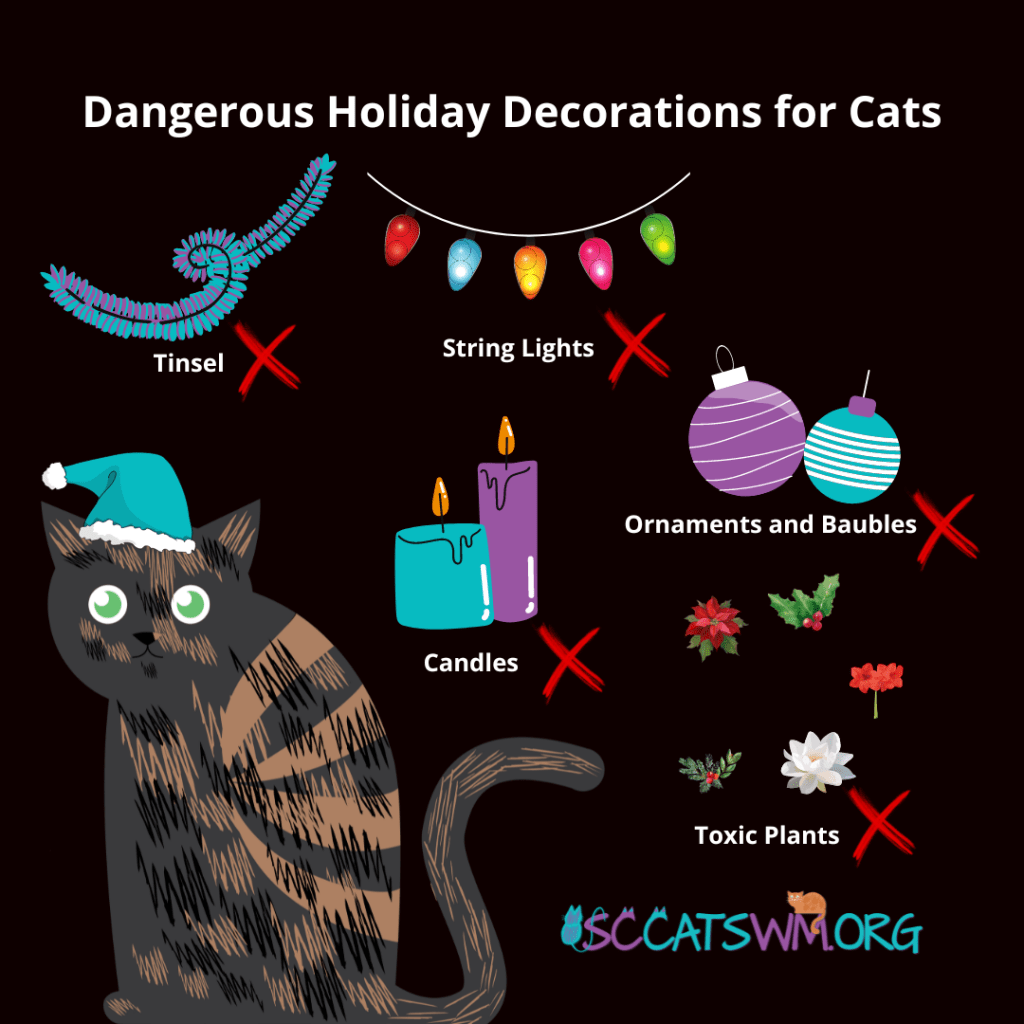 - Toxic Plants: Mistletoe, holly, and poinsettias, common in holiday decor, are toxic to cats if ingested.